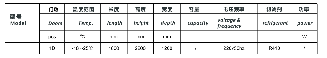 -Aluminum alloy handles -High-performance, low-energy compressor, automatically enters power saving mode when reaching the set temperature -Ventilated evaporator built into the cabinet -Microcomputer digital display thermostat with one-button temperature control -Built-in LED lighting -Static condensing unit, maintenance-free -Insulation material: polyurethane, CFC-free, density 40 kg/m3 -Operating temperature range is -18°C to -25°C under ambient conditions of 32°C 65%H.R. - Voltage & Frequency: 220V 50Hz